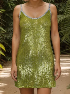 Women Spaghetti Strap Sleeveless Dress Summer Sparkle Sequins Mini Party Dress for Vacation Cocktail Beach Streetwear