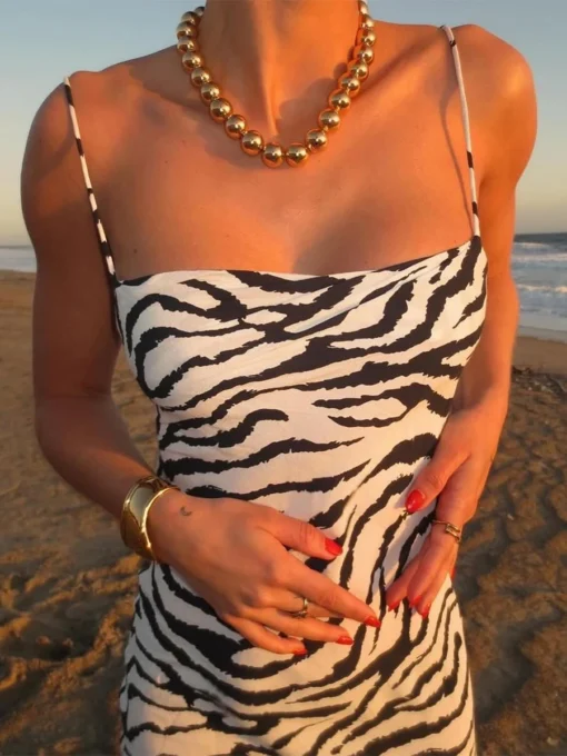Women’s Zebra Print Cami Dress Sleeveless Tie Backless Bodycon Long Dress Summer Beach Dress